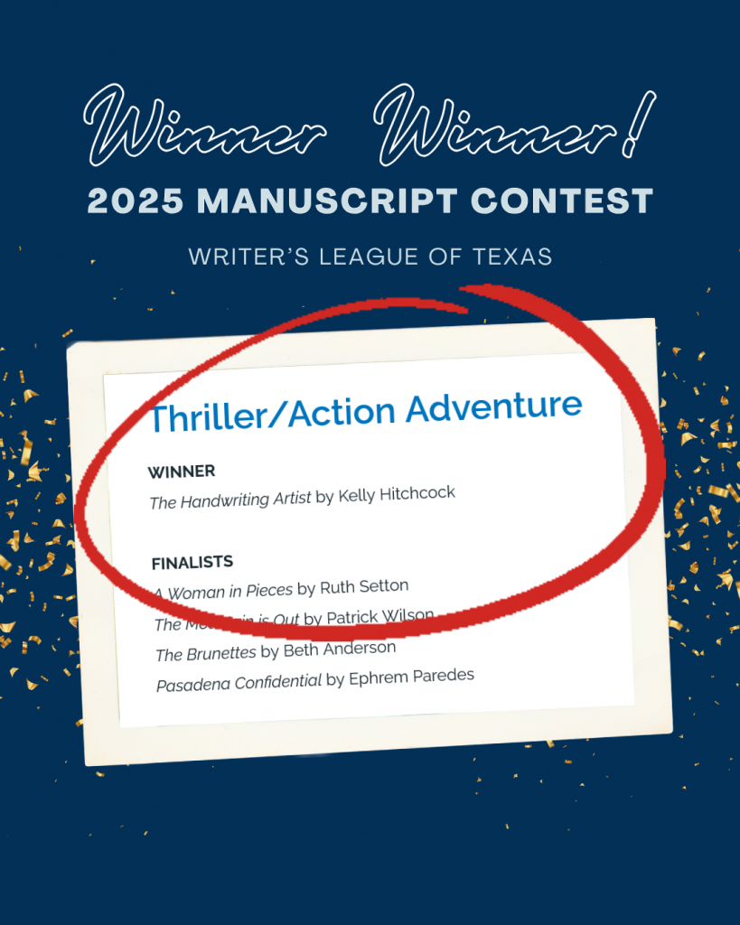 But fast forward to the present, I have also been busy writing the first draft of my NEXT novel, which is a satire thriller. As with my last work in progress, I entered it in the annual Writer’s League of Texas manuscript contest, more as a way to get some early feedback and a helpful critique to let me know if the book is worth finishing.